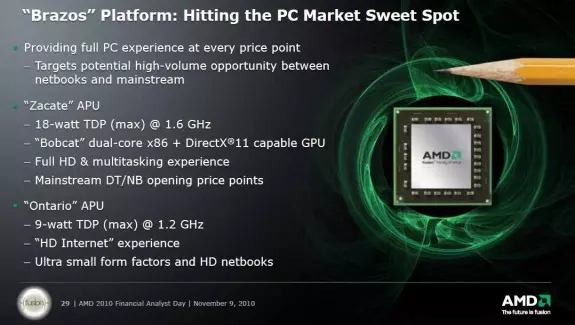 Az újdonságok esetében a legnagyobb előny az Atom platformmal és az Atom processzorokkal szemben, hogy nagyobb CPU teljesítményt és jobb grafikus teljesítményt nyújtanak, de ezzel együtt akkumulátoridő és szolgáltatások tekintetében sincs okuk szégyenkezésre. A Brazos platform Ontario chippel szerelt változata a HD netbookok piacát, míg a Zacate változatok az egybegépek, a kompakt asztali konfigurációk és a kereskedelem fő áramába szánt noteszképek piacán próbálnak majd hódítani.