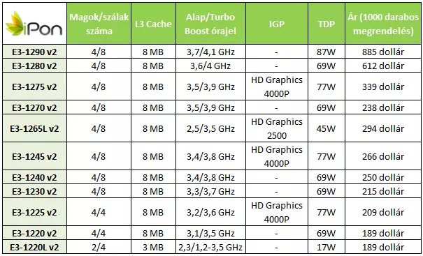 Az újdonságok közül három modell kínál HD Graphics 4000P típusú integrált videó vezérlőt, egy Xeon E3-1200-as szerverprocesszor pedig – név szerint az E3-1265L – a kevésbé ütőképes Intel HD Graphics 2500-as IGP-re támaszkodik. A többiekben nincs aktív integrált videó vezérlő. A Xeon E3-1200 v2-s processzorok elődeikhez hasonlóan négymagos felépítéssel rendelkeznek, de van köztük kétmagos, alacsony feszültség mellett üzemelő példány is, ami csak 17W-ot fogyaszt. Ezzel sikerült 3 wattot nyerni az előző generációs E3-1220L modellhez képest, amely még 20W-os TDP-vel bírt.