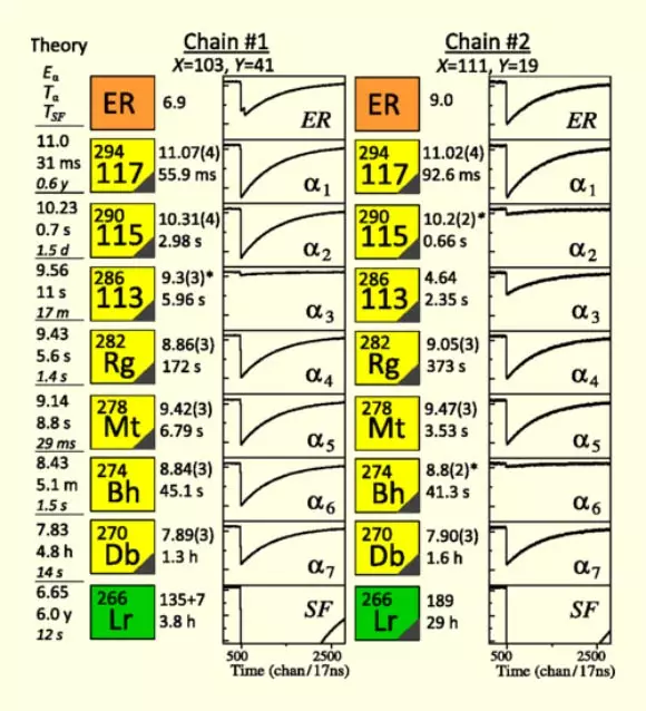 Ezen ütközések adatainak elemzésével még nem végeztek, viszont időközben úgy döntöttek, hogy a detektorok működőképességének megerősítése érdekében megpróbálkoznak a 117-es elem létrehozásával is. Sikerük még értékesebb annak fényében, hogy a kísérletek során azonosították a bomlási sor egyik eddig ismeretlen lépését. Tanúi voltak annak, ahogy a 105-ös rendszámú dubnium egy két protonból és két neutronból álló alfa-részecskét kisugározva a laurencium egy eddig sosem látott izotópját hozza létre.