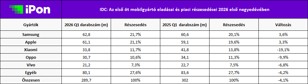 A Samsung és az Apple vitte a prímet az első negyedévben, és nekik még növekedni is sikerült. A Galaxy okostelefonokból 2,2 millió példánnyal fogyott több az egy évvel ezelőtt mért adathoz képest, ami 3,6 százalékos gyarapodás. A Samsung összesen 62,8 millió készüléket tudott leszállítani, ami a jelenlegi piaci körülmények között nagyon szép teljesítmény. Elsősorban annak köszönhető ez a siker, hogy a Galaxy S26 rajtja minden képzeletet felülmúlóan erősre sikeredett.