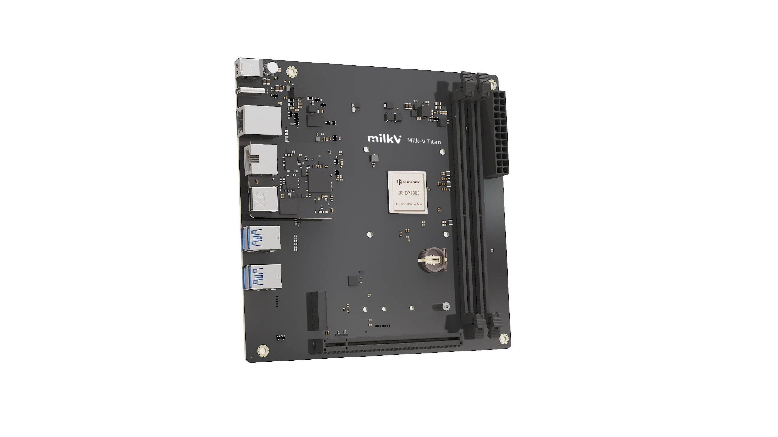 Az új alaplap a Milk-V Titan nevet kapta, fedélzetén pedig egy RISC-V architektúra köré épített processzor kapott helyet, méghozzá egy Ultra-RISC ÚR-DP1000 típusú modell, ami összesen nyolc processzormaggal rendelkezik. Ezek a processzormagok négy darab kétmagos csoportba rendezve dolgoznak, egy-egy páros 4 MB-nyi megosztott harmadszintű gyorsítótárat foghat munkára, azaz 16 MB-nyi L3 Cache található a lapkán. A 2 GHz-es magórajelen ketyegő processzor tökéletesen megfelel az RVA22 profilnak, már ami az utasításkészletek támogatását illeti, valamint az RVA23-as profilt is támogatja, de utóbbinál a vektorbővítmény még hiánycikk.