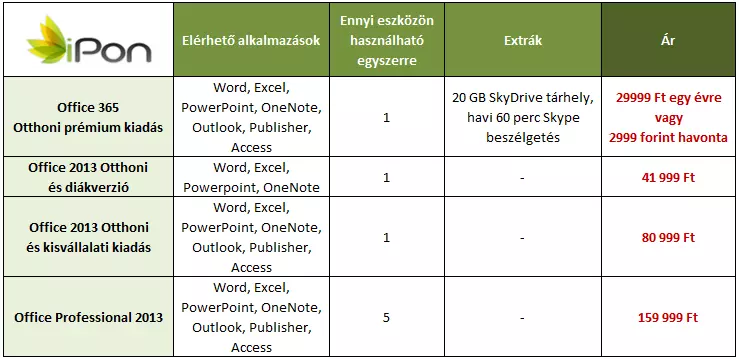 A különböző Office 2013 csomagok tulajdonságai. A táblázat nagyítható!