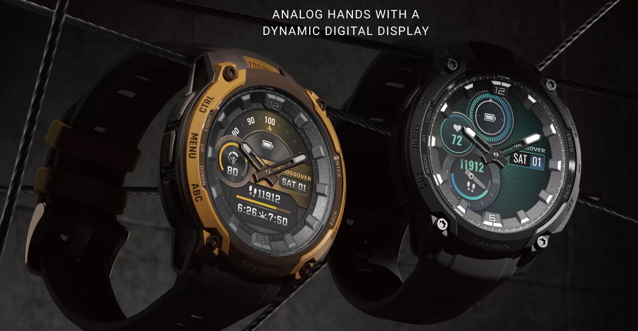 A Garmin megtartotta az analóg mutatókat, sőt mi több, még fejlesztett is ezek technológiai hátterén (Revodrive). Egyébként a szokványos lehetőségeket nyújtja szoftveresen az új Instinct rengeteg digitális számlapot vonultat fel, amik itt igazodni tudnak az analóg mutatókhoz. Fontos újítása az Instinct Crossover AMOLED-nek, hogy megkapta az integrált LED-es lámpát, ami nagyon hasznos lehet rossz látási viszonyok mellett. A szokásos helyen, a tokfülek között kapott helyet a világítás.