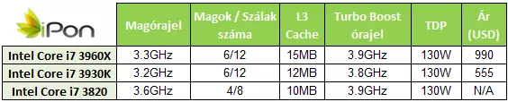 Az asztali megoldások piacán 8 CPU mag helyett tehát be kell, hogy érjük hattal, a 20 MB-nyi harmadszintű megosztott gyorsítótárból pedig maximum 15 MB-nyi áll rendelkezésre, de ez az érték modelltől függően természetesen változik, ahogy az lentebb is látható. A mai napon megjelent processzorok specifikációit a lenti táblázat összesíti. Érdekességként a Core i7-3820-as processzor specifikációit is feltűntettük, de ez a modell majd csak később jelenik meg kereskedelmi forgalomban, így jelenleg várható ajánlott végfelhasználói ára sem ismert.