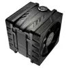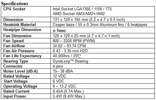A Cooler Master a V6GT esetében a gyártó 55 darab alumínium lamellát alkalmaz, amelyek aszimmetrikusan, 5 fokban döntve helyezkednek el a rendszerben, így a légellenállás igen kedvezően alakul. Ez annyit tesz, hogy több levegő tud átáramlani a lamellák között, ami jobb hatásfokú hűtést eredményez. A lamellák előtt egyébként két oldalon egy-egy 120 mm-es átmérőjű ventilátor helyezkedik el, amelyek DynaLoop csapágyazással rendelkeznek. A légkeverők percenkénti a 800-as és 2200-as közötti fordulatszám tartományban üzemelnek terheléstől függetlenül, így a megmozgatott levegőmennyiség értéke 34 és 94 CFM között helyezkedik el, természetesen ventilátoronként. A zajszint minimális értéke 15 dB(A), míg maximális fordulatszámon 38 dB(A) zajszintet generál egy ventilátor. A piros ledes világítással ellátott ventilátorok élettartama 40000 üzemóra.