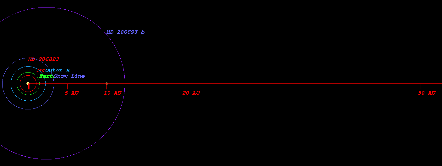A HD 206893 sokkal fiatalabb a Napnál – a dinoszauruszok uralma idején formálódott –, de egyébként nagyon hasonló hozzá, és 30 százalékkal nagyobb tömegű ugyan, de hasonló fémtartalmú. Bolygórendszere ugyanakkor nagyon eltérő. A Jupiter tömegének körülbelül 20-szorosát kitevő HD 206893 B mellett található körülötte egy HD 206893 C jelű objektum is, amelynek a tömege körülbelül 11-szerese a Jupiter tömegének, valamint egy másik bolygójelölt is, amelynek a tömege körülbelül megegyezik a mi rendszerünk legnagyobb bolygójának tömegével. Található benne egy gyűrű is, egy óriási aszteroidaöv, amely azonban sokkal messzebb van a mi Kisbolygóövünknél.