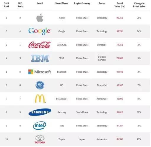 Az Apple illetékesei igazán büszkék lehetnek a vállalat teljesítményére, ugyanis a 2013-as év legértékesebb márkája az Apple lett. A második helyre a Google futott be, ami szintén komoly meglepetés. A két technológiai iparágban tevékenykedő nagyvállalat eredménye igazán meglepő, hiszen most először fordult elő a TOP 100-as lista fennállása óta, hogy letaszították a dobogó legfelső fokáról a Coca Colát, ami a lista indulása, azaz 2000 óta minden évben a világ legértékesebb márkájának bizonyult.