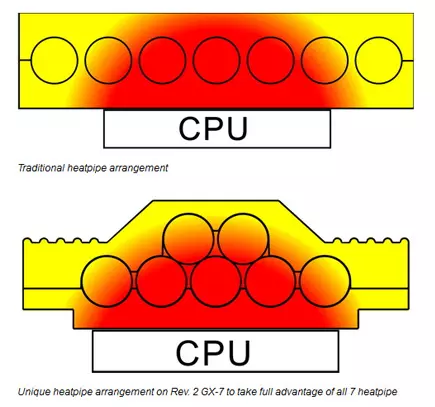 A GX-7-es processzorhűtő elődjéhez hasonlóan szintén 130 x 65 x 159 milliméteres mérettel érkezik, hőcsövekből pedig összesen hetet alkalmaz. A hét darab "U" alakú hőcső egy réz talpazaton keresztül veszi át az adott processzor által termelt hőt, és onnan viszik tovább az alumínium lamellákhoz.