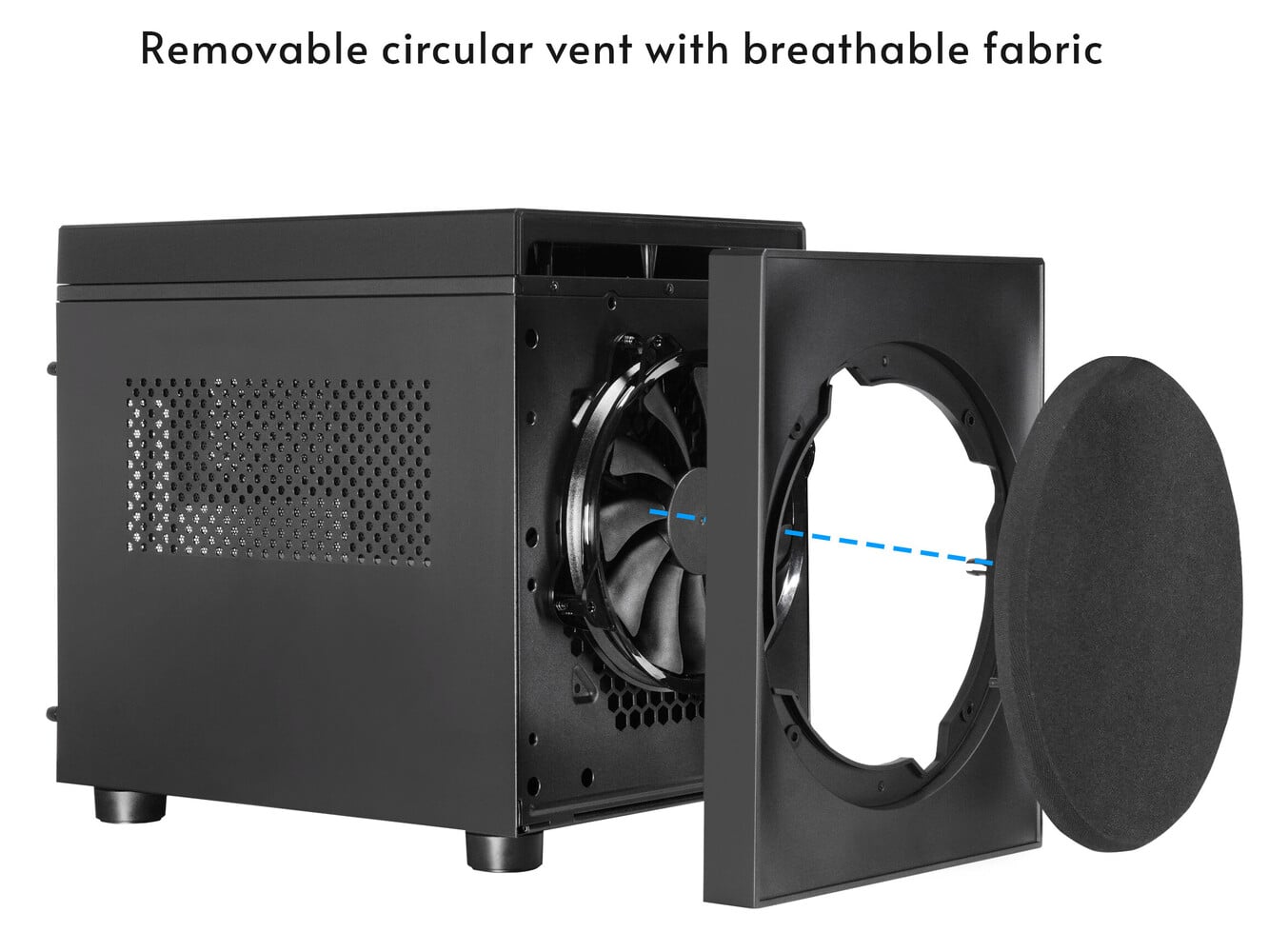 A Hi-Fi szegmens által inspirált dizájn jóvoltából az előlap mögé egy szokatlanul nagy átmérőjű, 200 milliméteres ventilátor került, ami egy 200 milliméteres mélynyomót szimbolizál, előtte pedig egy légszűrőként funkcionáló borítás teszi különlegesebbé az új ház megjelenését. A microATX és Mini-ITX formátumú alaplapokhoz készített számítógépház teljesen letisztult, sallangmentes dizájnnal érkezik, ahogy az egy mélyládától is elvárható. A fekete köntöst viselő Cube 385 milliméter mély, 355 milliméter magas, illetve 265 milliméter széles, tömege pedig 4,64 kilogramm. A váz 0,6 milliméter vastag SPCC acélból készült, a beltér pedig kellően tágas ahhoz, hogy biztosítható legyen az elvárt bővíthetőség.