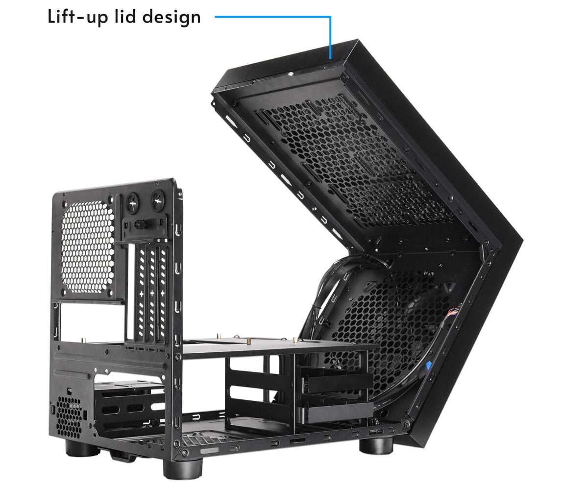 A szerelhetőséget segíti, hogy nemcsak a ház jobb- és baloldali oldallapját lehet leszerelni, hanem a ház tetőlapjának hátoldal felé eső végén található rögzítő elemeket is oldhatjuk, ezáltal előre lehet dönteni a tetőlapot és az előlapot, mint egy teherautó fülkéjét. A manőver után hozzá is férünk a „motortérhez”, ami jelen esetben egy vízszintesen elhelyezett alaplaptálcát rejt, ami nagyméretű szerelőablakkal és kábelmenedzsmentet segítő kivágásokkal egyaránt rendelkezik.