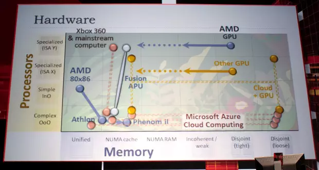 Az újítást a Microsoft egyik szakembere, Herb Sutter mutatta be. A heterogén rendszerekben rejlő lehetőségek egyszerű kiaknázását segítő C++ AMP a C++ programnyelv kiegészítésének, egyfajta bővítménynek tekinthető, amely a DirectCompute technológiát próbálja majd minél hatékonyabban munkára fogni. A lenti prezentációs képkockán a heterogeneitás dzsungele látható - ahogy Mr. Sutter nevezi.