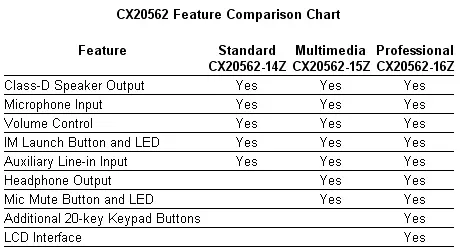 Az egy chipből álló CX20562-es család digitális audio feldolgozó processzorral, audio kodekkel és egy D-osztályú erősítővel is fel van szerelve, ennek köszönhetően fejlett audió feldolgozást, visszhang-mentesítést és zajszűrést is lehetővé tesz. A chip USB interfésszel AUX analóg bemenettel egyaránt rendelkezik. Az egység fejhallgató kimenettel és belső mikrofon bemenettel egyaránt bír, ezen kívül digitális/analóg hangerőszabályzásra, hangszóró- és mikrofonnémításra is képes. A chip verziótól függően akár 20 gombból álló billentyűzet és LCD kijelző kezelésére is képes.