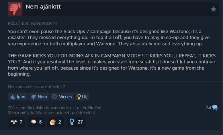 Az első játékos értékelések ráadásul döbbenetes dolgokat említenek. A kampányt nem lehet pausolni, mert az egész olyan, mintha egy Warzone mérkőzést játszana az ember. Annál is inkább tűnik annak, mivel ha a játékos nem csinál semmit, inaktivitás miatt a kampány kidobja őt a játékból. Elképesztő! Kidobja a kampány az embert… Tán ezt játékot is AI tesztelte már, amelyik nem megy el mosdóba, és ez a hiba emiatt nem is jött elő?