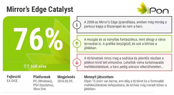 Összességében a Mirror’s Edge Catalyst egy abszolút élvezhető játék, fantasztikus atmoszférája van a városnak, ami csodásan lett felépítve. A zene sajnos nem lett olyan eltalált és emlékezetes, mint az első részé, de rossznak sem nevezném. Egy jól megalkotott világot kaptunk, érdekes társadalmi berendezkedéssel és kulcsfigurákkal, amiket viszont a játék nem tudott eléggé megmutatni, de egy folytatásban vagy kiegészítőben még kiaknázható lehet a bennük rejlő potenciál. A parkour jobb benne, mint valaha, az erőltetett harc viszont már kevésbé lehet üdvözítő annak, aki inkább pacifista beállítottságú. Ha nem riadtok vissza az ilyesmitől, nem lesz vele különösebb gondotok, bár némi megszokást igényel a közelharc.