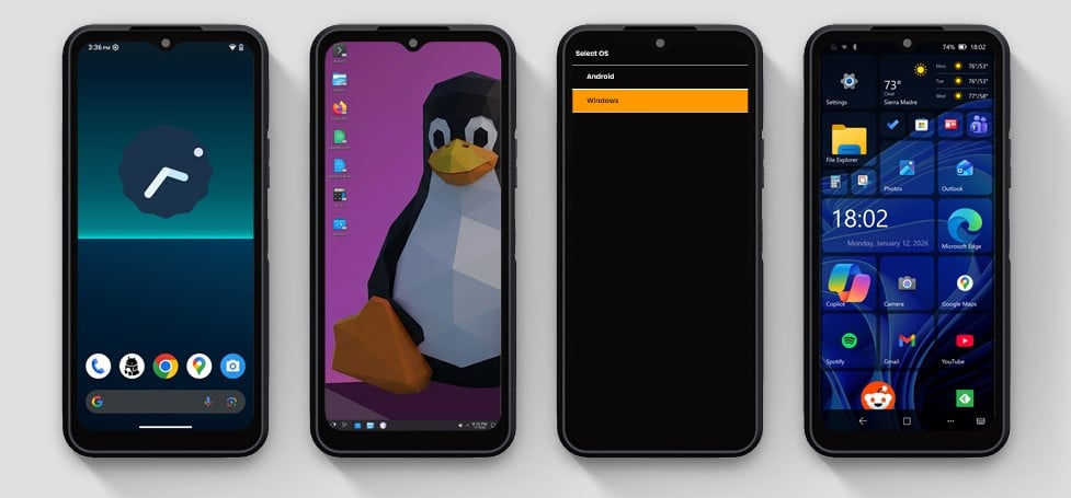 A NexPhone az Android mellett felvonultat egy Linuxot (Debian), és a címnek megfelelően kapott még Windows 11 operációs rendszert is. A szerkezethez lehet külső megjelenítőt csatlakoztatni, és ilyen formában személyi számítógépként használható. Miközben van a rendszereknek mobilos felülete is, a Windows 11 például a régi csempés dizájnnal jelenik meg a tenyérnyi kijelzőn.