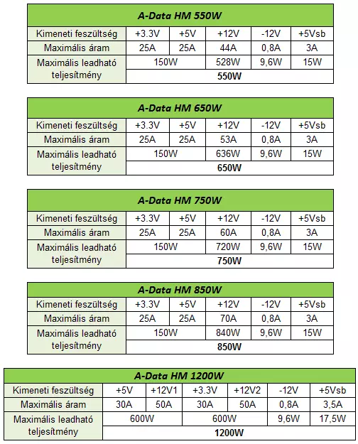 A minőségi, japán kondenzátorokkal ellátott újdonságok közül az 1200W-os modell két darab +12V-os tápággal érkezik, míg a többi egység esetében egyetlen +12V-os ág áll rendelkezésre. A termékek pontos specifikációit a fenti táblázat tartalmazza. A tápkábelek pontos számáról a gyátó oldalán találunk információt: az egyes modelleknél egy elég nehezen értelmezhető táblázat mutatja meg, hogy milyen tápcsatlakozókkal ellátott kábelekkel érkeznek (1200W, 850W, 750W, 650W, 550W).