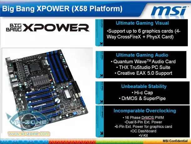 A Big Bang Xpower alaplap az Intel X58-as északi hídjából és ICH10R deli hídjából álló platformra alapoz és természetesen LGA-1366-os tokozással ellátott processzorok fogadására let felkészítve. Az alaplap több szempontból is különleges: a gyártó 16 fázisú tápáramkört biztosít a processzor számára, amelyet két darab 8 tűs csatlakozó táplál, és PCI Express x16-os slotokból ezúttal hat darab áll rendelkezésre, amik SLI és CrossfireX rendszerek építéséhez egyaránt alkalmazhatóak. Az alaplapon SATA 6 Gbps-os és USB 3.0-s portok egyaránt jelen lesznek, de természetesen ez még nem minden.