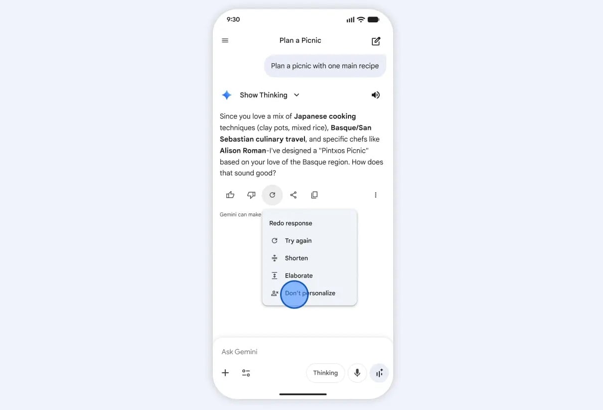 A Google elmondása alapján a Személyre szabott segítséggel akkor fog élni a Gemini, amikor ténylegesen szükségét érzi, arra következtet a neki szegezett kérdésből, parancsból, hogy a legjobb minőségű választ az extra információkra támaszkodva képes megadni. Nem fogja feleslegesen a személyes adatokat túrni a generatív MI, és ezeket a tanításhoz sem használja fel, a cég általános adatvédelmi irányelveihez igazodva működik majd ez az újítás is. Személyre szabott segítség bekapcsolását követően elérhető lesz egy olyan új opció, amivel direkt személyre szabás nélküli válaszok is kérhetők.