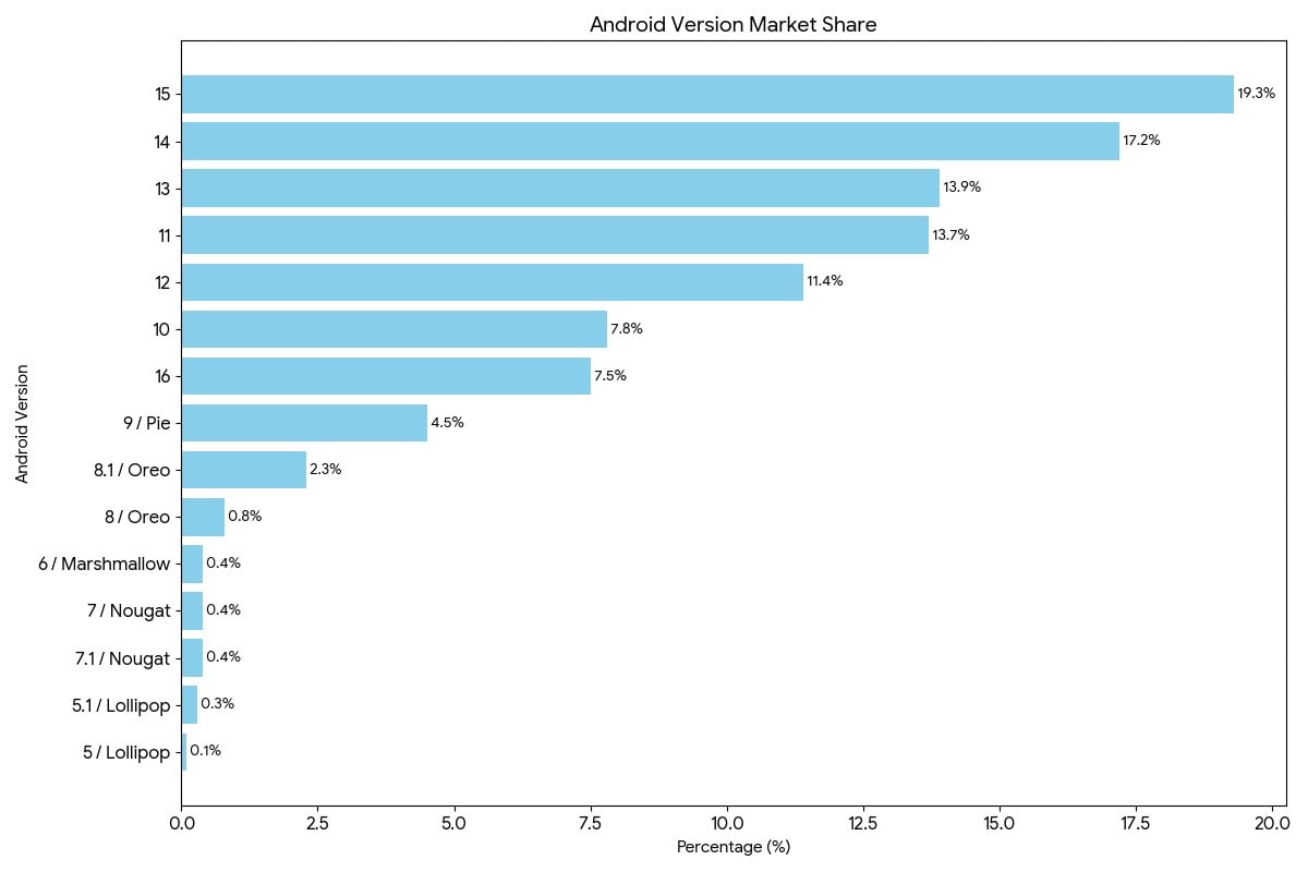 A Google által most megosztott adat szerint decemberig csak a teljes eszközállomány 7,5 százalékát érte el az Android 16 operációs rendszer. Még a régi Android 10 is több eszközön fut.