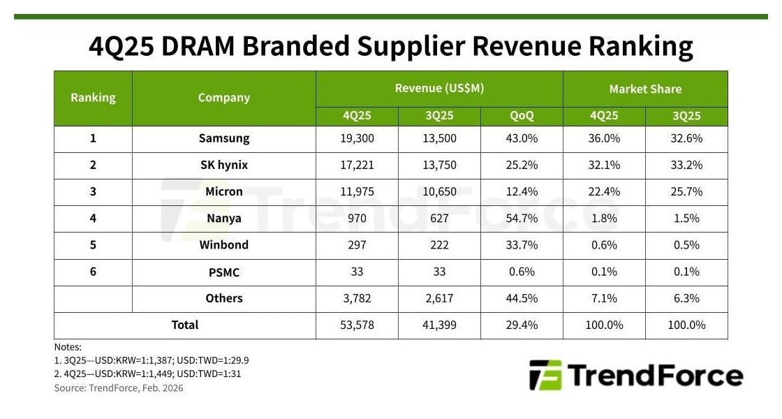 Az egyes piaci szereplők teljesítményét nézve azt láthatjuk, hogy a Samsung visszavette piacvezető pozícióját, miután 19,3 milliárd dolláros teljes árbevételt könyvelhetett el a negyedik negyedév folyamán, ezzel 43%-os növekedést tudott felmutatni, piaci részesedése pedig 3,4 százalékpontos növekedést követően 36%-ra emelkedett. Az átlagos értékesítési árak nagyjából 40%-kal emelkedtek negyedéves szinten, miközben a bitszállítási teljesítmény egy számjegyű mértékben nőtt – részben a HBM üzletág teljesítményének köszönhetően.