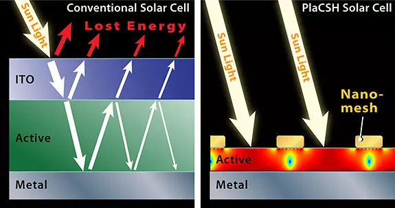 A cella felső rétegét egy rendkívüli finomságú aranyháló alkotja, amelyben 30 nanométer vastagságú fémszálak kereteznek 175 nanométer átmérőjű lyukakat. Ez alatt egy 85 nanométeres vastagságú szerves polimer réteg foglal helyet, alulról pedig egy fémfilm zárja a struktúrát. A cella gyakorlatilag minden lényeges mutatója (vastagsága, a háló lyukainak átmérője, illetve ezek egymástól való távolsága) kisebb, mint az átalakítandó fény hullámhossza, ami azért érdekes, mert az ilyen struktúrák gyakorlatilag csapdába ejtik a fényt, vagyis az elnyelt sugarak nem képesek távozni a rétegek közül. A PlaCSH néven emlegetett találmány hatásfoka még megalkotóit is meglepte.