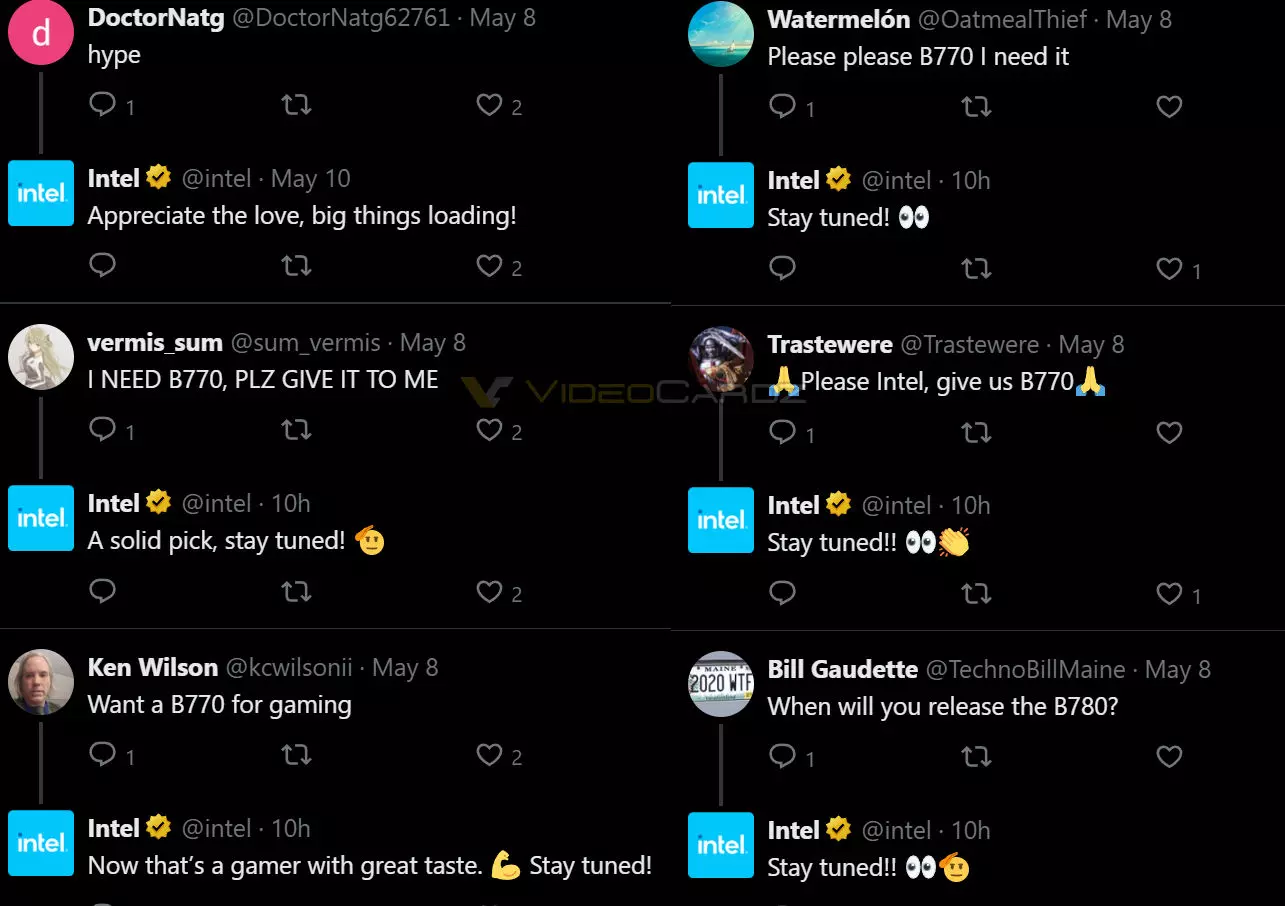 Az Intel Arc A770 utódjaként funkcionáló Arc B770 akár már a Computex 2025 idején felbukkanhat, legalábbis erre utalnak azok a sejtelmes válaszok, amelyek elkezdtek záporozni az Intel X fiókján keresztül azokra a felhasználói hozzászólásokra, amelyekben kifejtették az érintettek, szeretnének B770-es videokártyát. Az Intel csapata ezekre a reakciókra többnyire azt válaszolta, hogy maradjon velük az adott felhasználó, valamint dicsérték egyesek ízlését is, akik B770-es videokártyát szeretnének.