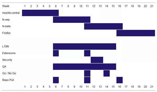 A tervezet alapján úgy néz ki, hogy a Firefox kiadások között 16 hét telhet majd el, azaz igen sűrűn olvashatunk majd olyan közleményeket, amelyek a Firefox legfrissebb verziójának érkezéséről adnak hírt. A gyártó az említett 16 hetes periódust természetesen fontosabb részekre bontotta, amelyek a főbb teendők elosztását segítik. Az első öt hétben a friss verzió új szolgáltatásait dolgozzák ki (Mozilla Central  szakasz). A hatodik hét folyamán a bővítmények fejlesztőihez is eljut a böngésző az új változat (Firefox-Experimental channel). A hetedik és a tízedik hét között kiadás menedzsmenttel kapcsolatos feladatokat végeznek, azaz javítják az aktuális verzió stabilitását és ha szükség van rá, kikapcsolnak néhány olyan új szolgáltatást, amelyek még nem működnek megbízhatóan.
