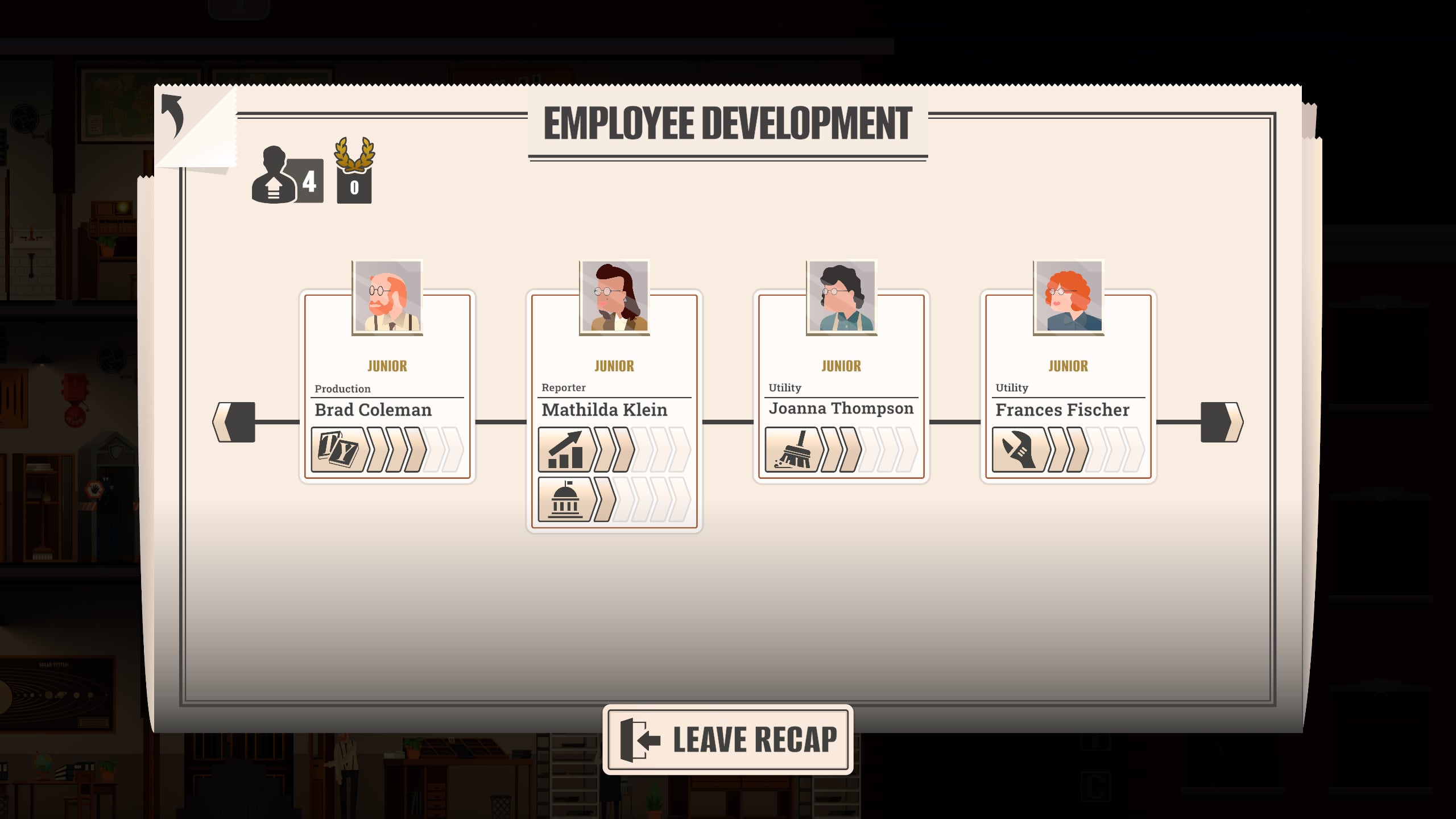 Nem meglepő módon a játékmenet lelke az, hogy mindenre figyelünk és mindent kézben tartunk. A mi feladatunk lesz megszervezni, hogy a firkászaink, tördelőink ne csak írjanak, hanem jót írjanak. A riporterek különböző témákra szakosodhatnak – politika, bűnügy, gazdaság, sport, szórakoztatóipar – és nem mindegy, kit küldünk ki egy katasztrófához, egy színdarab premierjére vagy egy polgármesteri sajtótájékoztatóra. Minden újságírónk három témában lehet jártas és hosszú órákban mérhető a különbség, ha egy veterán profit vagy egy zöldfülűt küldünk ki a helyszínre.