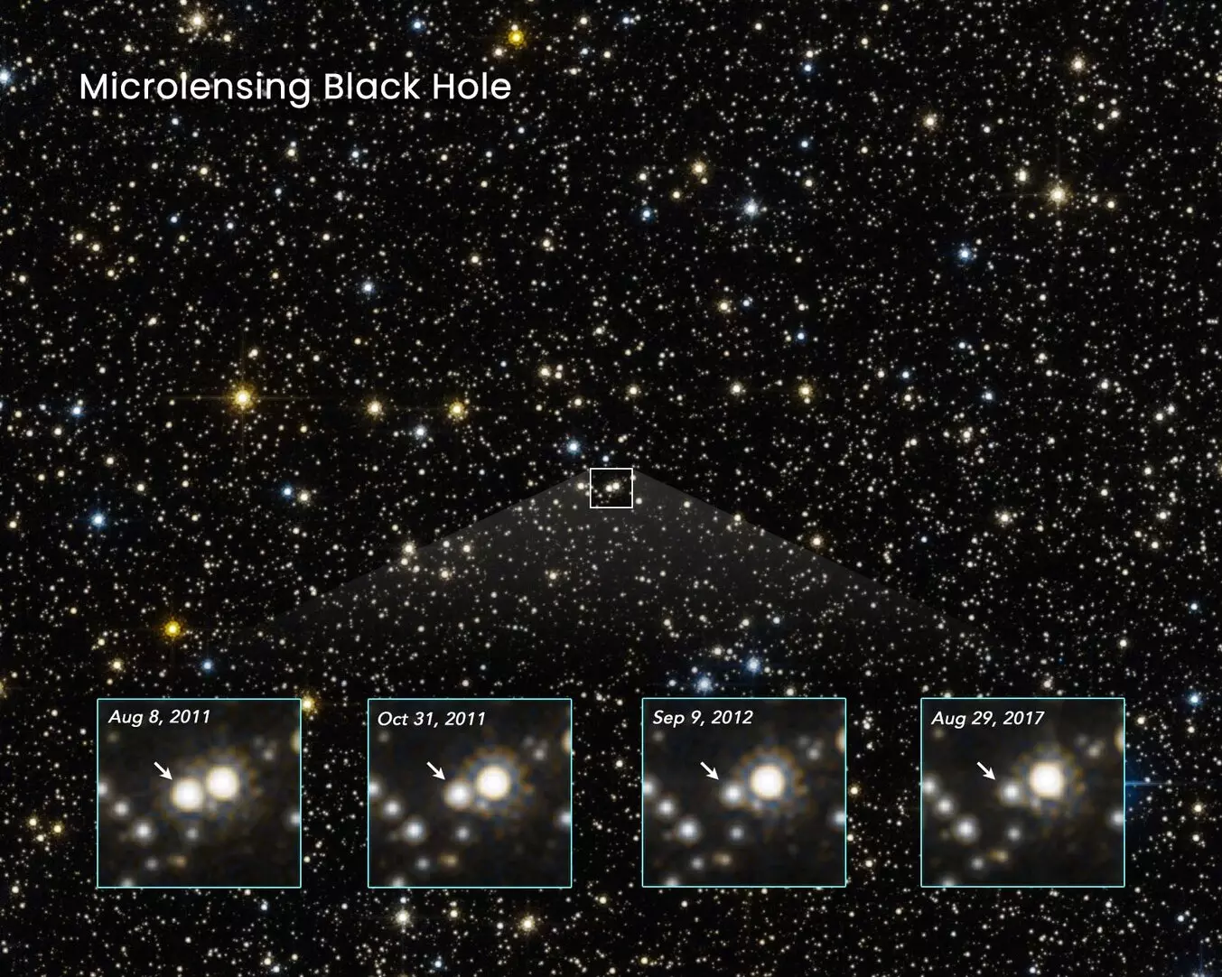 2011-ben két égboltfelmérési program (OGLE, MOA) keretében is észleltek egy ilyen, kisebb méretekben zajló, úgynevezett mikrolencsézési eseményt. A lencsézett csillag egy halvány, vöröses égitest, amely 20–60 ezer fényévnyire lehet a Földtől a galaxisközpont irányában. A lencséző objektum különböző hullámhosszakat vizsgálva 15–100-szorosára erősítette fel ennek a csillagnak a fényét, amikor a megfigyelő rendszerek és a csillag közé került, majd amikor kikerült a ebből a vonalból, a csillag ismét elhalványulni látszott. A lencsézés 250–300 napig tartott, ami jelentősen hosszabb, mint ami a legtöbb mikrolencsézés során tapasztalható. És a fényváltozási profil is érdekes: a csillag fénye nagyon hirtelen kezdett erősödni, ami azt sugallja, hogy egy pici, de nagyon nagy gravitációjú lencséző objektum állhat a háttérben.