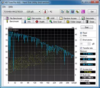 A HP 655-nél már előre utaltunk az Asusban található 320 GB-os Toshiba merevlemezre, mely nem csak zajtermelésben, de grafikonok formájában is jelzi, ő bizony újabb generáció annál, amit az ellenlábas noteszben láthattunk. Hőmérsékletet itt ismét tudtunk mérni, bár teljesen felesleges volt, hiszen a 40 fok alatti értékek szinte előre borítkolhatók voltak, ismerve a hűtőrendszer tesztelése során szerzett tapasztalatainkat.