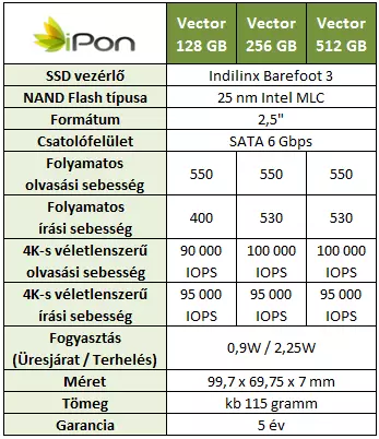 A gyártó hivatalos weboldalán található dokumentum alapján a Vector család tagjai napi szinten, átlagos kliensoldali terhelés alkalmával 20 GB-nyi írást viselnek el, méghozzá öt éven keresztül. A dokumentumból persze az egyes modellek tulajdonságai is kiderülnek. Ezeket az alábbi táblázatban foglaltuk össze: