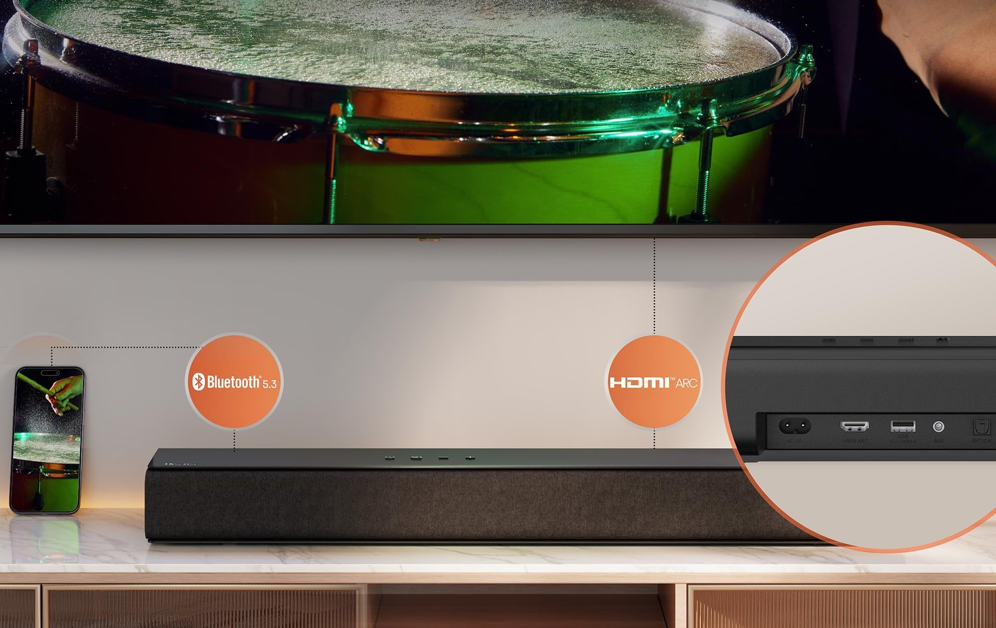 A televíziókhoz HDMI ARC vagy optikai felületen csatlakozhat a HS1000, de kapott AUX csatlakozót is. Képes zenét, podcastet lejátszani USB-s adathordozóról is szükség esetén. Továbbá biztosít a hangprojektor Bluetooth 5.3 modult. Ez olyankor lesz érdekes, ha a felhasználó például az okostelefonjáról, táblagépéről vagy éppen a laptopjáról szeretne jobb minőségben, komolyabb teljesítményt mozgósítva zenét hallgatni.