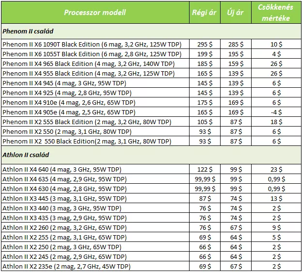 A gyártó által eszközölt legnagyobb mértékű árcsökkentés 18,9%-os volt, de egyes processzorok ára csak kevesebb, mint egy dollárral, egészen pontosan 99 centtel csökkent. Érdekesség, hogy a Phenom II X4 905e modellnél árnövekedést láthatunk, ez a processzor ugyanis a korábbinál 4 dollárral többe kerül. Különös, hogy a gyártó a Black Edition modellek esetében több processzornál is azonos árat állapított meg: a Phenom II X2 550 Black Edition és 555 Black Edition modellek egyformán 87 dollárba kerülnek, sőt, még a szorzózáras Phenom II X2 550-es modellhez is ekkora összegért cserébe lehet hozzájutni, persze csak akkor, ha 1000 darabos tételben vásárolunk. A Phenom II X4 925, Phenom II X4 945 és szorzózár-mentes Phenom II X4 955 Black Edition egyformán 139 dollárba kerülnek, de az Athlon II-es családban is találunk számos ár-egyezést. A többi modell árazásáról az alábbi táblázat ad némi információt.