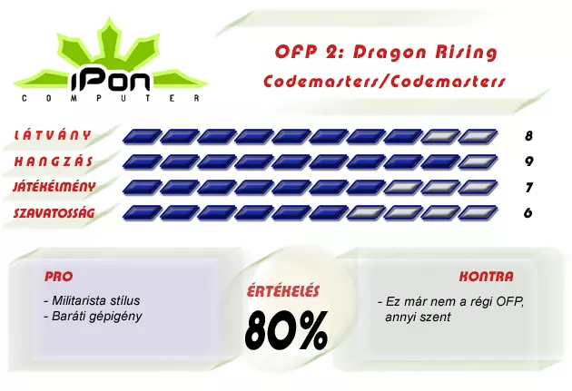 Az OFP 2 egy minden téren gyengített folytatás, melynek célja a könnyebb játszhatóság volt, amiért a valósághűséget kellett feláldozni. Akinek tetszik az ArmA 2, de csak képeken és videókon át talál benne élvezetet, vegye meg az OFP 2-t, mert nem csalódik majd, ám azok, akik a Bohemia méltó ellenfelét látták a Codemasters új gyermekében, ne pocsékolják rá az idejüket, mert ez nem szimulátor, hanem játék. Igaz, annak jó, és végső soron ez a fontos, nemde?
