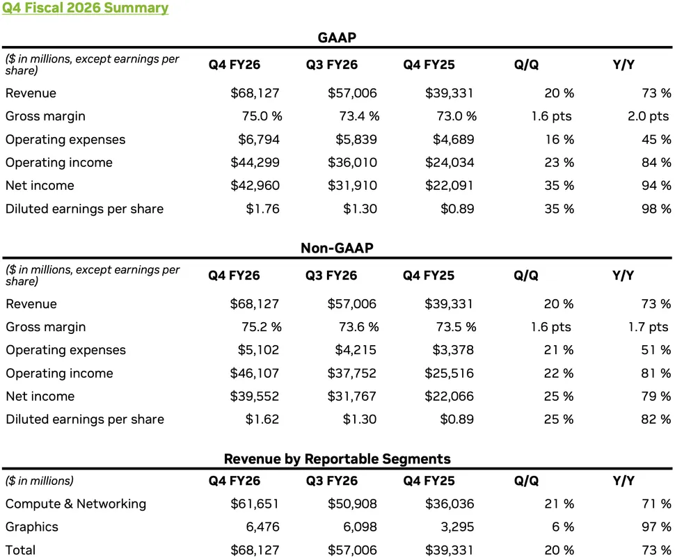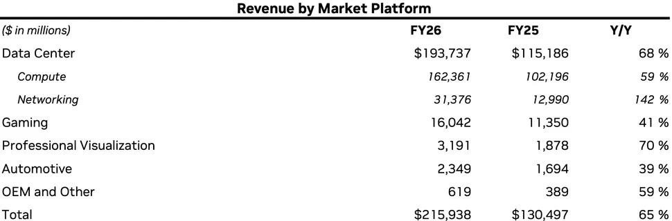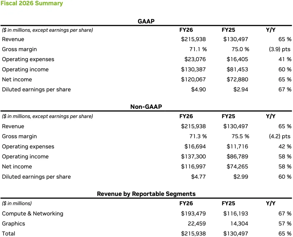 Az Nvidia pénzügyi részlege publikálta a vállalat legfrissebb pénzügyi eredményeit, amelyek ezúttal a 2026-os pénzügyi év negyedik negyedévéről, illetve a teljes pénzügyi évről is képet adnak: a vállalat mindkét területen rekordokat döntött, hála az AI-láz pozitív hatásainak. Beszédes adat, hogy éves szinten a klasszikus GPU eladásokból csak 22,201 milliárd dollár folyt be, míg az adatközpontokba szánt termékek értékesítéséből 193,737 milliárd dolláros teljes árbevételt könyvelhettek el – ebből is látszik, mekkora sikert ért el a vállalat az AI szegmensben.