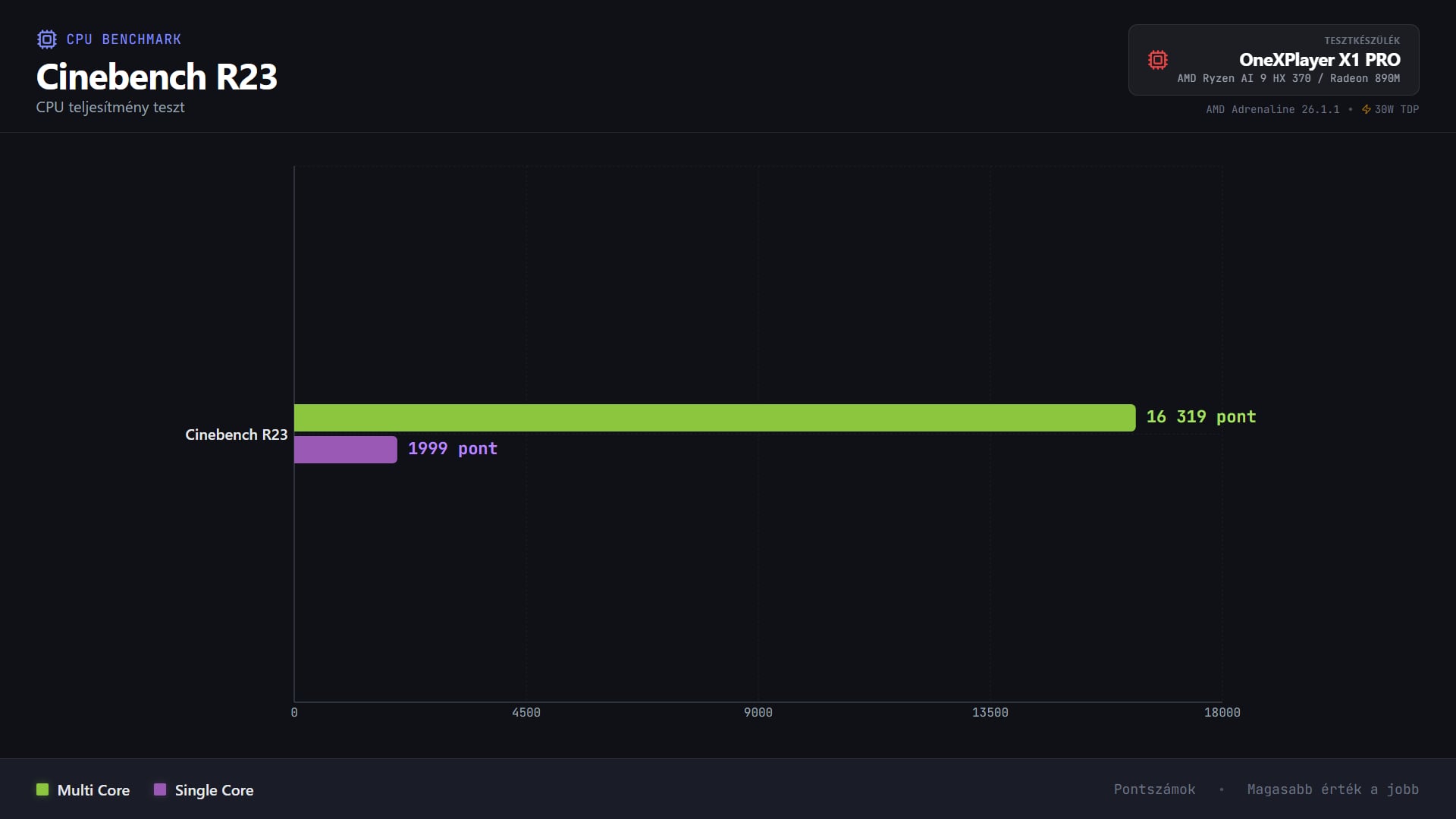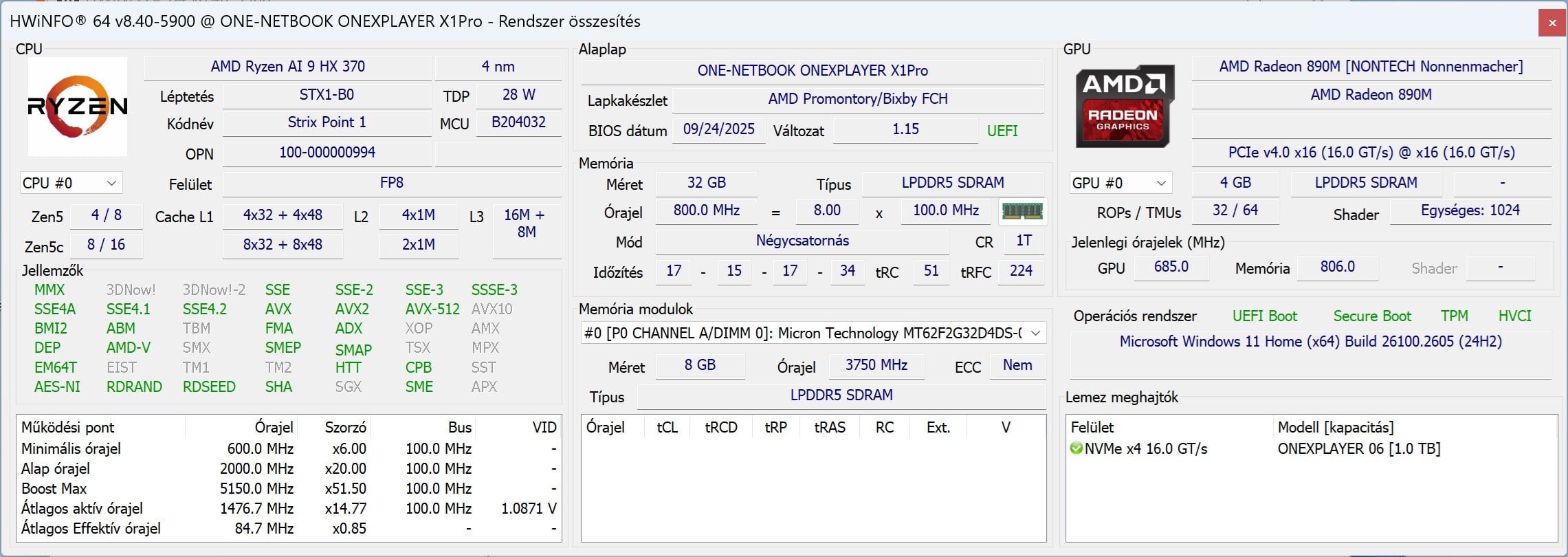 | CPU | AMD Ryzen AI 9 HX 370 (12 mag / 24 szál, 5.1GHz max boost, 80 TOPS AI) |