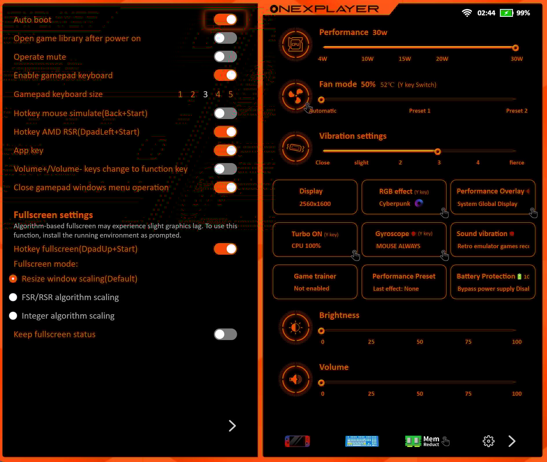 A már említett Turbo gomb mosolyt csalt az arcomra, hiszen utoljára a 90-es években találkoztam olyan számítógéppel, amin hasonló gombot nyomogathattam. A lenyomásakor felugró menü a készülék beépített szoftvere, mely a OneXConsole névre hallgat és a tálcáról is indítható.