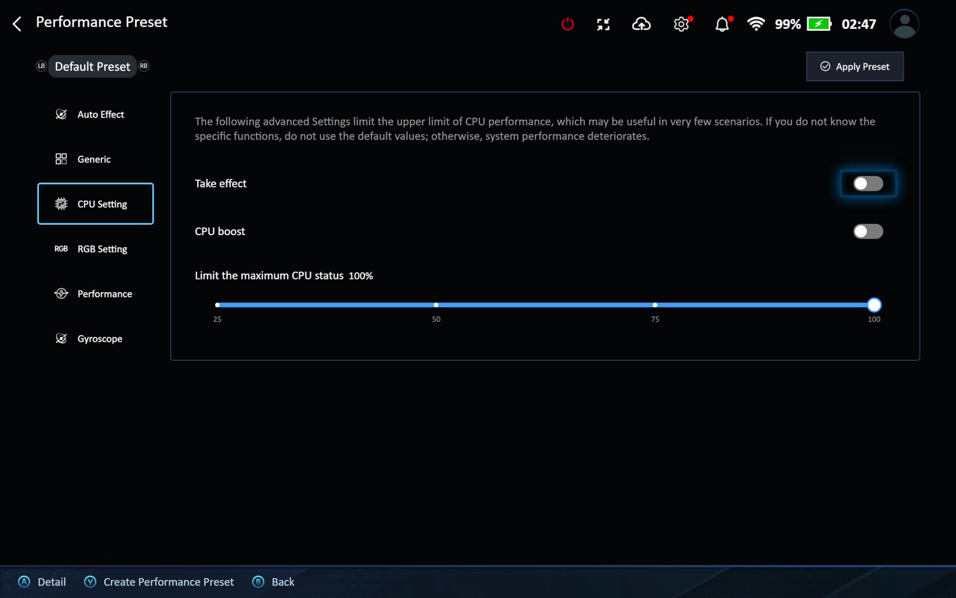 Attól függően, hogy mi a cél, a gyorsmenüben állíthatjuk a TDP-t, így a processzor kevesebbet is ehet, mint a maximális 30W. Ez kifejezetten handheld módban hasznos, amikor nincs lehetőség áramforrás csatlakoztatására, így némi kísérletezéssel az összes játékunkhoz megtalálhatjuk az optimális beállítást teljesítmény és üzemidő tekintetében. Ez meglehetősen messze van az egykori konzolos élménytől, cserébe jóval rugalmasabban áll a felhasználókhoz.