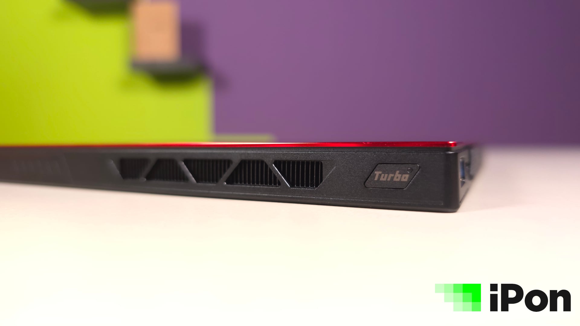 A felső perem másik oldalán a hőkivezető nyílás, illetve egy Turbo gomb található, mely a gyári segédszoftver megnyitására szolgál. Ez lényegében egy overlay, mely minden egyéb alkalmazáson felül jelenik meg a képernyőn és a géppel kapcsolatos beállítások Kánaánját tárja elénk, elsők között a CPU teljesítményét befolyásoló TDP csúszkával.