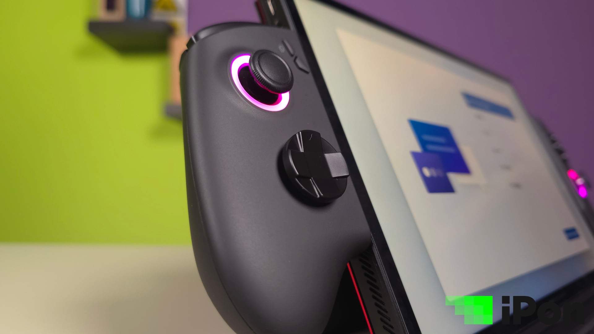 Végül jöjjön a kettévágott kontroller, avagy a gép oldalain látható rögzítősínekbe pattintható vezérlők. A készülék szélein könnyen elhagyható takarólemezek védelmezik a csatlakozókat, melyekbe a kiegészítőket kellett illesztenem. A folyamat meglehetősen intuitív és egyszerű volt, miután sikerült beilleszteni, a kart mindkét esetben, illetve oldalon lefelé kellett tolni ütközésig. A sikert kattanó hang jelzi, illetve az analóg karon bekapcsoló RGB-s világítás.
