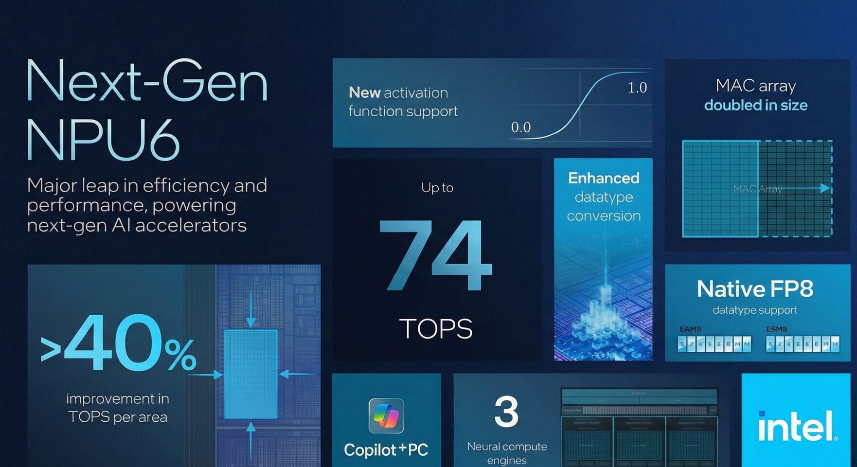 A Lunar Lake fedélzetén negyedik generációs NPU dolgozik, de már az ötödik generációs verziót is bejelentették, az a Panther Lake sorozat tagjaival debütálhat, teljesítménye 50 TOPs magasságában helyezkedik el, ami nem egy nagy előrelépés, viszont teljesítménysűrűség terén már nagyobb javulást ment végbe, hála a kompaktabb felépítésnek.