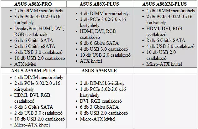 Az öt új típus magáénak tudhatja a már megszokott ASUS jellegzetességeket. Az 5X Protection az érzékeny alkatrészeket védi a rövidzárlattól, a túlfeszültség, túláram ellen és más hasonló kockázatoktól. Az „USB 3.0 Boost with UASP Mode” az USB 3.0 egyébként is magas áteresztőképességét javítja úgy, hogy optimalizálja az átviteli parancsokat. Az új modellekre letisztultabb UEFI BIOS került, amely természetesen továbbra is grafikus felületen teszi lehetővé a felhasználók számára a rendszer paraméterezését, a funkciók elérését. Az új, FM2+ foglalattal ellátott ASUS A88X és A55 alaplapok hazai elérhetősége a jövő héttől esedékes, az árak egyelőre nem ismertek.