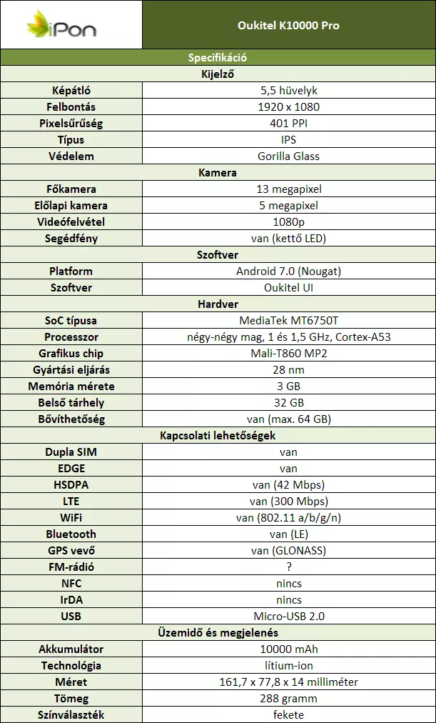A motortérben a kiváló hatékonysággal dolgozó MediaTek MT6750T központi chip található, ami nyolcmagos és két klaszterre van felosztva. Ez a lapka kizárólag Cortex-A53 feldolgozó egységeket tartalmaz, melyek 1, illetve 1,5 GHz-es órajelen üzemelhetnek. A grafikus feladatok végrehajtásáért pedig egy 650 MHz-re járatott Mali-T860 MP2 IGP a felelős, melynek bizony lesz munkája a Full HD felbontásból adódóan. A K10000 Pro már 3 GB-nyi rendszermemóriával felszerelkezve látta meg a napvilágot, ami általában gondtalan működést eredményez még aktívabb multitasking mellett is. A háttértár 32 GB-os kapacitást nyújt, mely szintén elegendő lehet a legtöbb érdeklődő igényének, de ha mégsem, akkor is ott a bővítési lehetőség, ennek sincs híján a masina. Az okostelefon természetesen rendelkezik 4G LTE hálózati modemmel (Cat.6), és információink szerint támogatja a B20 sávot is, ami remek hír. Ezen felül a K10000 Pro kelléktárában fellelhető még 802.11 a/b/g/n szabványoknak megfelelő Wi-Fi, Bluetooth modul és A-GPS vevő is, ami a gyorsabb és pontosabb eredmény érdekében a GLONASS műholdakra is képes támaszkodni a munkája során. Dual-SIM-es a mobil, így még több ember igényének felelhet meg.