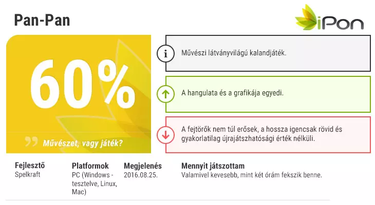 Összességében tehát, amennyiben Pan-Pan grafikai stílusa vagy alapkoncepciója elnyerte a tetszésünket, abban az esetben minden körülmények között tegyünk vele egy próbát, ellenkező esetben viszont csak akkor ruházzunk be rá, ha 1,5-3 órányi, könnyed agytornára vágyunk.