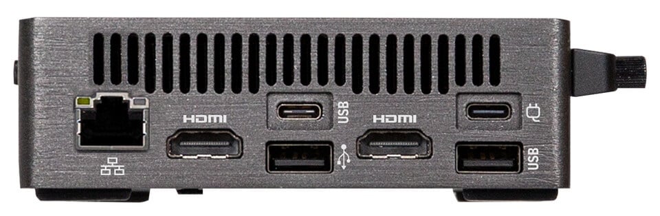 A 112,6 milliméter mély és 119,4 milliméter széles apróság mindössze 34,4 milliméter magas, azaz kellően kompakt ahhoz, hogy ne foglaljon sok helyet az asztalon. A 0,47 literes űrtartalmú házban összesen két darab M.2-2280-as M.2-es SSD kártya fér el, az egyik PCI Express 5.0 x4-es, míg a másik PCI Express 4.0 x4-es csatolófelülettel dolgozhat. A 0,47 literes űrtartalmú ház előlapi portjai között egy USB4-es Type-C, valamint két darab USB 3.2 Gen2 Type-A port található, illetve a fejhallgató csatlakozóról sme kell lemondani. A hátlapra két darab HDMI 2.1-es videó kimenet, egy Gigabites Ethernet port (RJ-45), valamint egy USB 3.2 Gen2 Type-C, egy USB 3.2 Gen2 Type-A, illetve egy USB 2.0 Type-A port került.