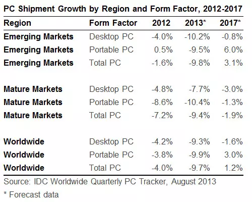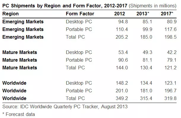 Az idei év második negyedéves adatai nagyjából azt a szintet hozták, amire az elemzők korábban számítottak, most mégis negatív irányban módosították a korábbi előrejelzéseket, ugyanis felmerült néhány újabb probléma. A PC piacon a vásárlói érdeklődés továbbra is meglehetősen nyomott, de ezzel együtt a fejlődő országok teljesítménye is romlott. Kínában a frissített előrejelzés alapján kétszámjegyű csökkenésre lehet számítani, ami a nagymennyiségű beragadt raktárkészletnek és a táblák, illetve okostelefonok iránti egyre nagyobb érdeklődésnek köszönhető. A negatív hatások következményeként a fejlődő országokban 2014 folyamán további csökkenés várható. A negatív hatások a korábban erős növekedést produkáló régiókba is begyűrűztek, így nem túl rózsásak a kilátások.