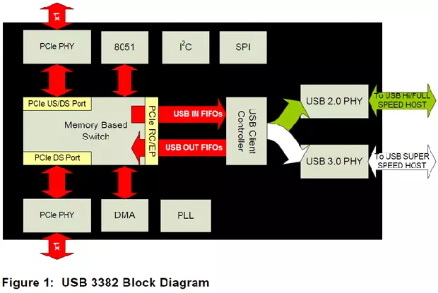 A második megoldás az USB 3382-as típusjelzést viseli. Ez a híd chip szintén egy USB 3.0-s portot kínál, de már két második generációs PCI Express sáv kezelésére képes és kínál néhány konfigurációs opciót is. A terméket első körben használhatjuk arra, hogy két PCI Express alapú eszközt az USB 3.0-s portra csatlakoztassunk, de arra is van lehetőség, hogy a két PCI Express 2.0-s sávot összevonva egyetlen eszköz számára kínáljunk nagyobb sávszélességet.  Egyetlen PCI Express 2.0-s sáv irányonként 500 MB/s-os sávszélességet biztosít, míg egyetlen USB 3.0-s port esetében az elméleti maximális adatátviteli sebesség 600 MB/s-os értéket képvisel.