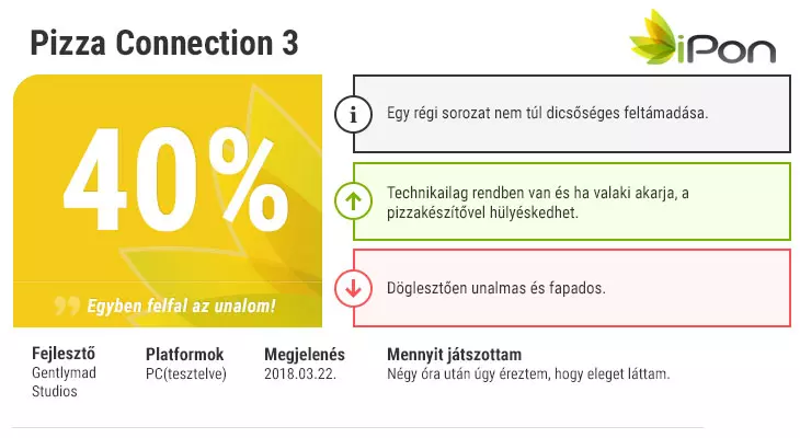 Köszöntem anyukámnak és apukámnak, megettem a reggelimet, majd leültem a gép elé, de a kedvenc LoL-os barátaim közül senki sem volt online. Márpedig muffmagnes_64, сука_666_блять, Testbot_@@@ és a többiek nélkül nem szeretek játszani. Gondoltam, kipróbálok valami újat és rátaláltam egy király játékra. Az a neve, hogy Pizza Connection 3 és csuda érdekes, bár kissé becsapós. Úgy hirdetik ugyanis, hogy ez egy úgynevezett menedzserjáték, amiben egy éttermet kell vezetni, de ilyesmiről szó sincs benne. Nagyon egyszerű, alig lehet benne bármit is csinálni. Kibérelsz egy éttermet, mert még sajátot sem építhetsz, csak átalakíthatod a meglévőket és akkor jönnek az emberek és esznek és neked ebből pénzed van és ez jó, mert ha sok pénzed van, akkor bérelhetsz egy új éttermet, ahova emberek bemennek és esznek. Sok pénzért. Szerencsére az étteremre alig kell figyelni, belerakhatsz pár tárgyat, de azokból sincsen sok, az alkalmazottak pedig dolgoznak, mint a gép. Véletlen események nincsenek, de néha jönnek csúnya gengszterek, akik ellen nem védekezhetsz, de te is küldhetsz másokra gonoszokat, és olyankor lehet ennek örülni. A neten azt olvastam, hogy a sorozat első két része nagyon összetett volt, de szerencsére ebből szinte mindent kihagytak, ami összezavarhatja a játékost. Ez nagyon megnyugtató érzés, mert harminc euróért nehogy már még gondolkozni is kelljen!