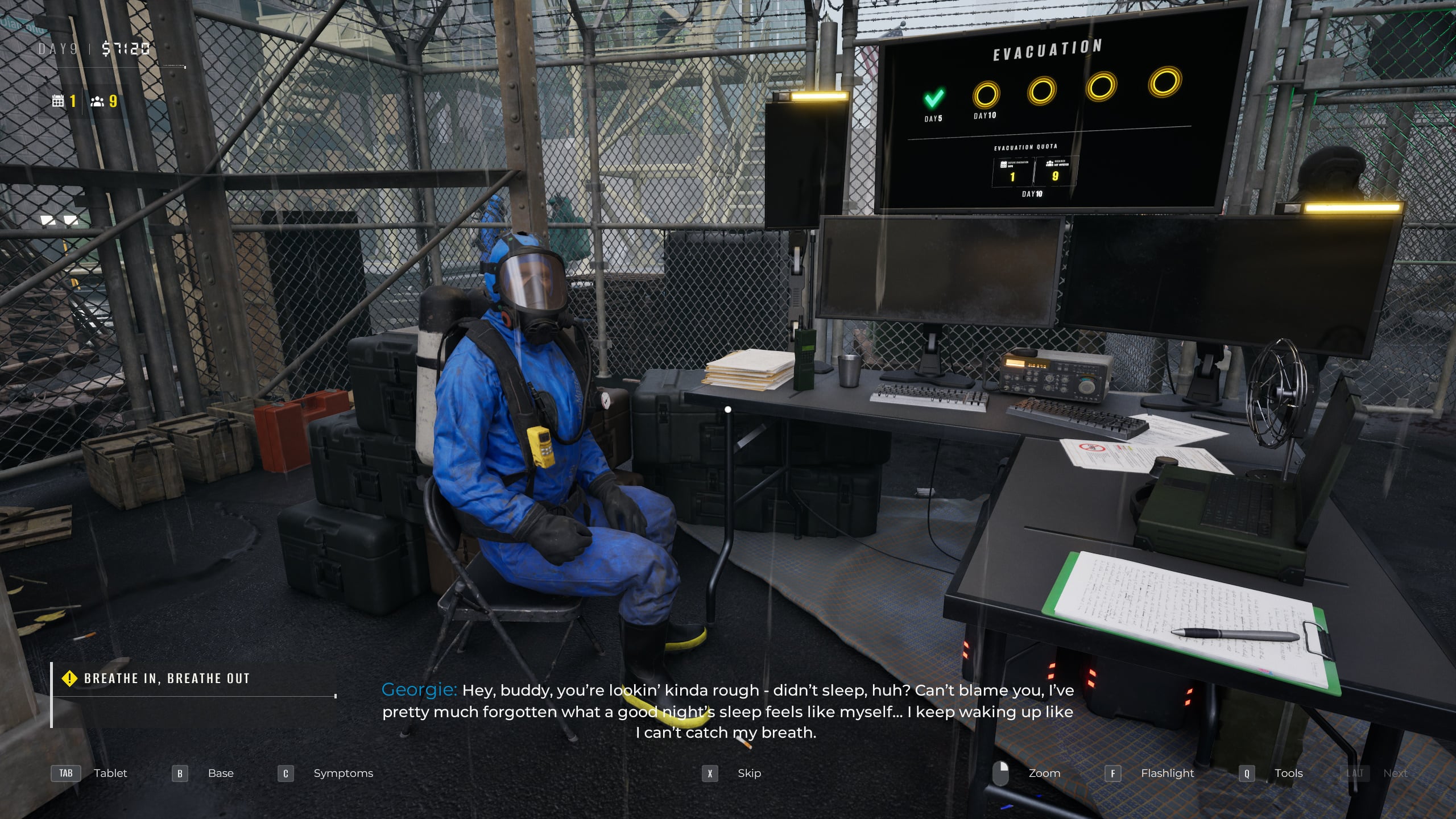 Ugyanis nem csak egy kapuban ácsorgunk élet és halál uraként. Egy ellenőrző pont vezetőjeként a megmentett és evakuációra váró civileket is életben kell tartanunk, ehhez pedig működő generátor, élelmiszer és gyógyszer kell, és persze az is hogy mindenki elférjen, legyen hely a karanténban akkor is, ha valakit 2-3 napon keresztül tartunk ott. Közben „hobbiként” boncolásokat is végzünk, hogy új tüneteket fedezzünk fel, ami megint csak ahhoz vezet, hogy egyre bonyolódik a munkaköri leírásunk. Kikapcsolódásként zombihorda támadásokat is vissza kell vernünk egy drónt irányítva pár naponta, ami érdekesen billeg a macera és a változatosság közötti vékony mezsgyén.