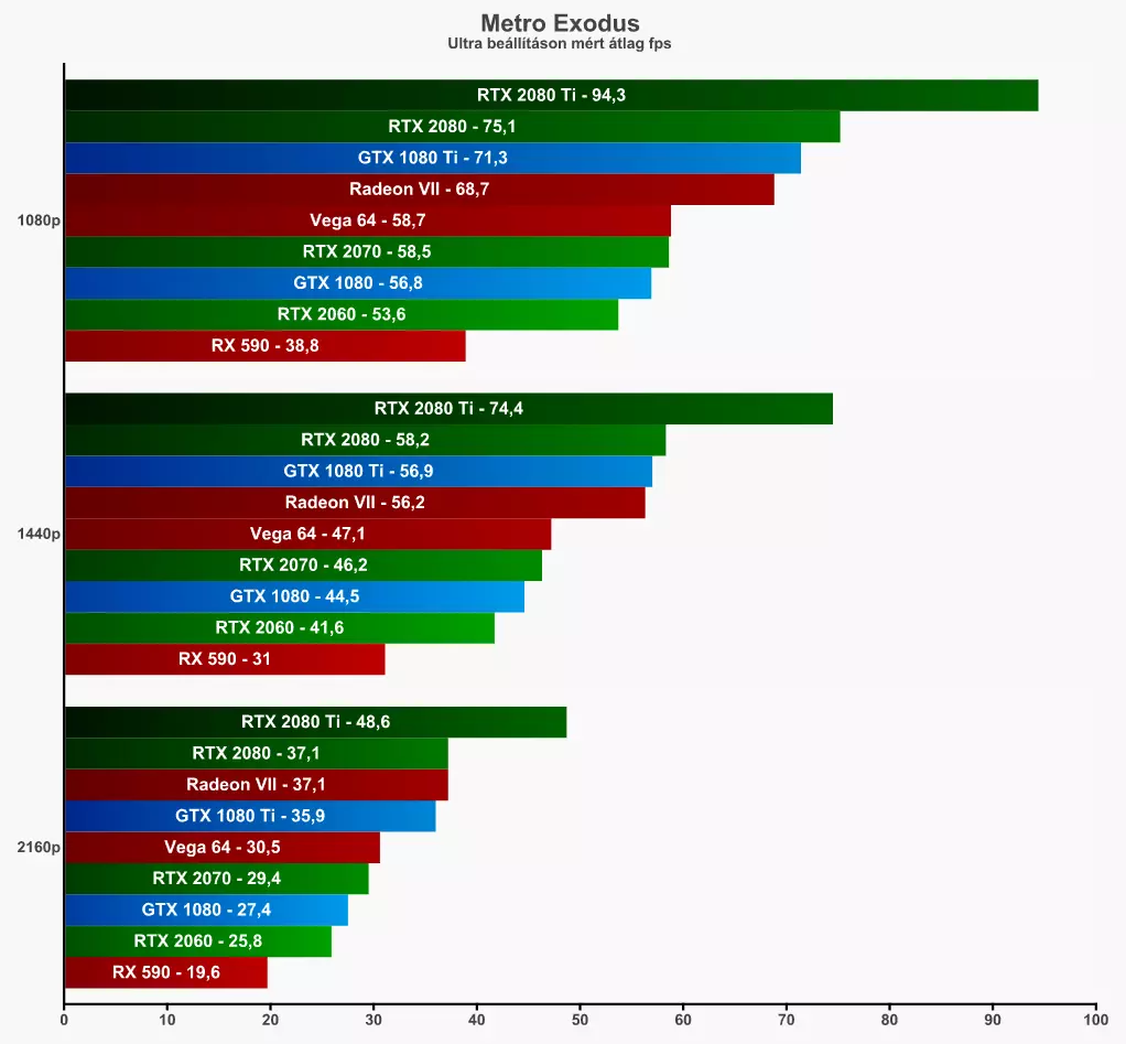 Megjegyzés: a gyárilag tuningolt kártyákat amennyire lehetett, visszaállítottuk a teszt idejére referencia órajelekre. A Radeon a gyári 1800 Mhz-es maximális boost órajelen ment, de túl sok különbség nem lehet az 1750-esekhez képest, mert szinte sosem érte el ezt az órajelet a fogyasztás limit miatt. Amint lehet, megnézzük az egyik AIB partner kártyáját is, hogy van-e észrevehető különbség.